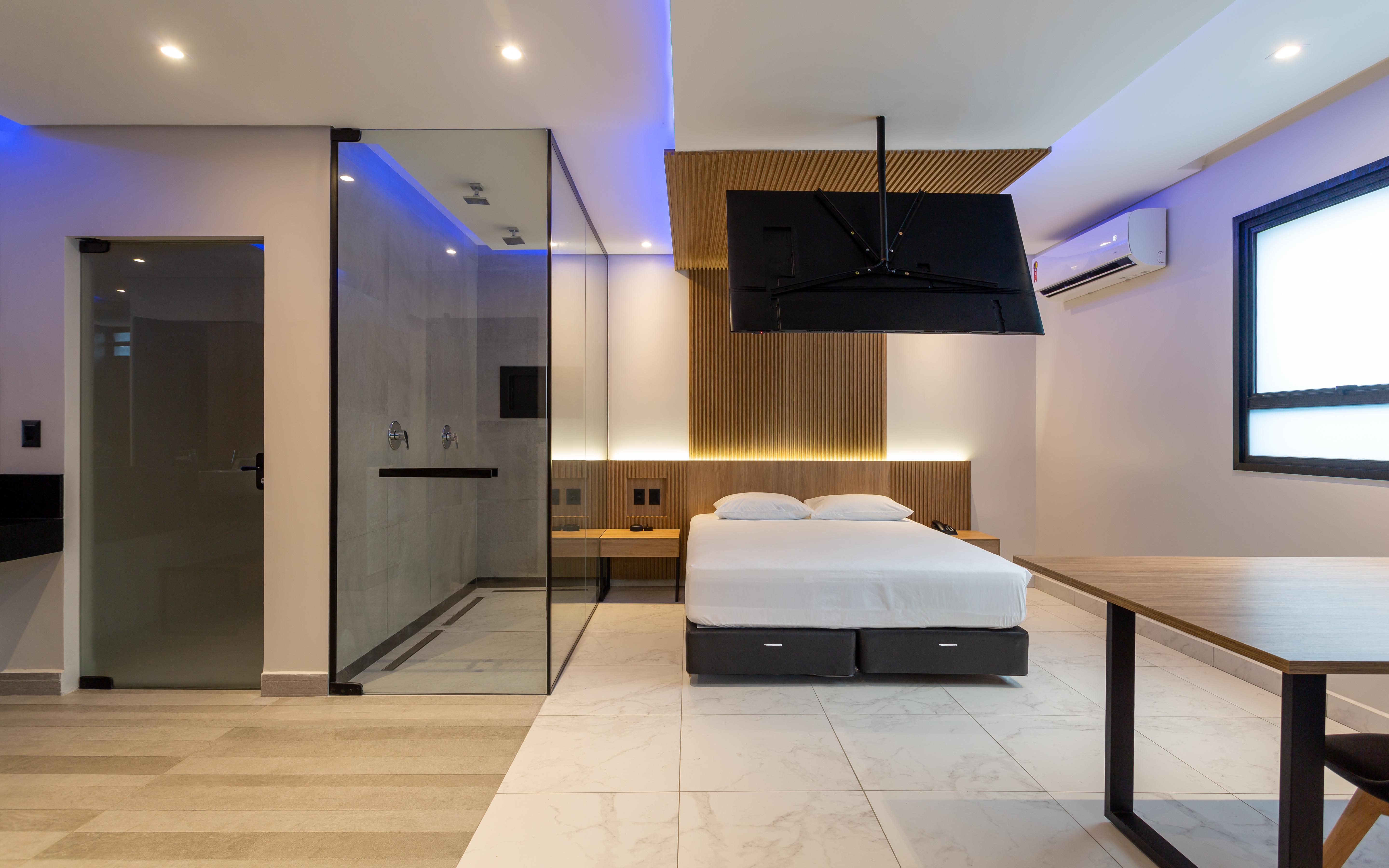 Acqua remete à fluidez da água. Luxo é dispor de uma piscina privativa. Com aquecimento térmico, a piscina da suíte proporciona um banho único em qualquer estação do ano.
