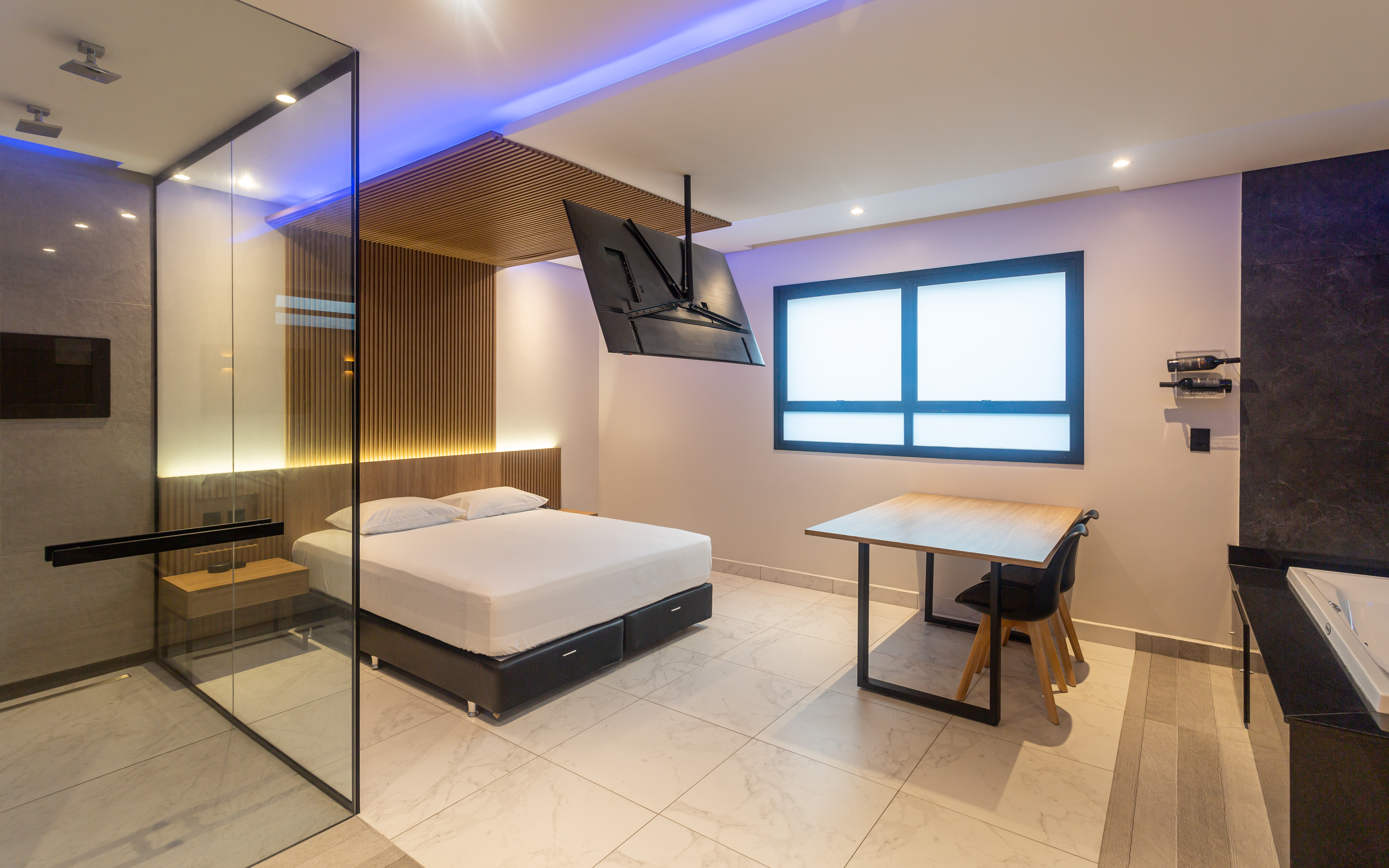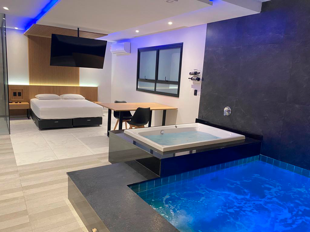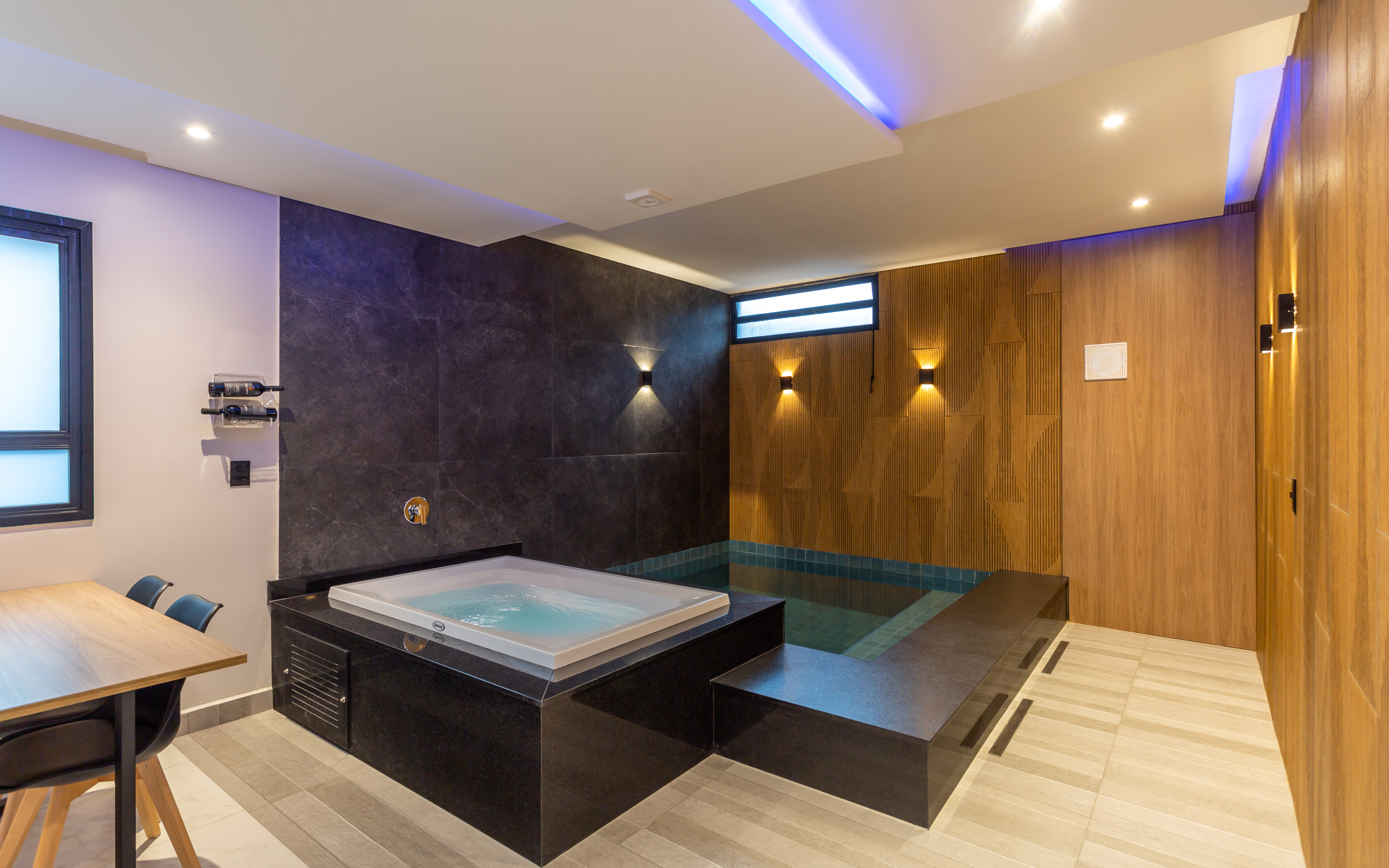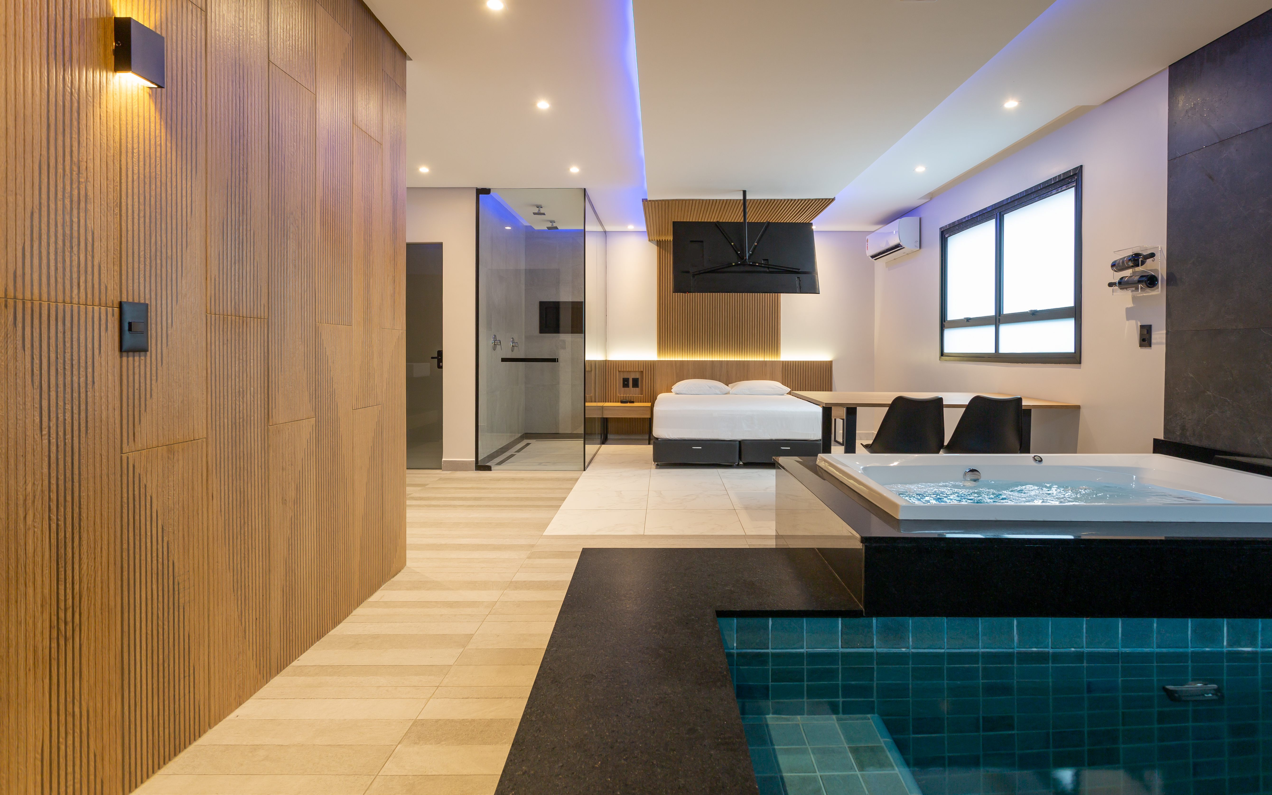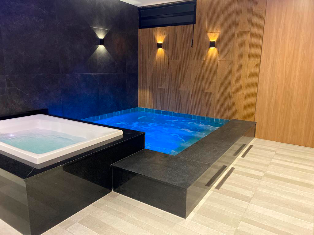 Acqua remete à fluidez da água. Luxo é dispor de uma piscina privativa. Com aquecimento térmico, a piscina da suíte proporciona um banho único em qualquer estação do ano.